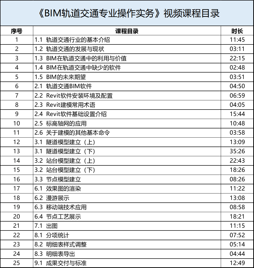 (2)BIM轨道交通专业操作实务:行业动态、基础操作介绍、轨道交通专业BIM模型建立、BIM技术应用、参数化构建创建、可视化技术应用(渲染、漫游、移动、工艺)、计量。